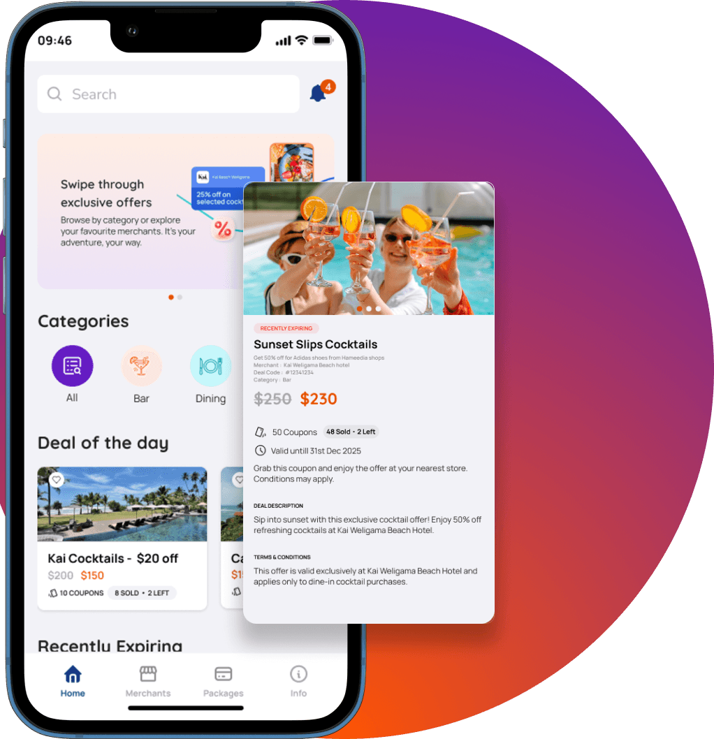 Your app updates as you travel. Whether you’re in Colombo or Mirissa, QPON shows what’s near right now.